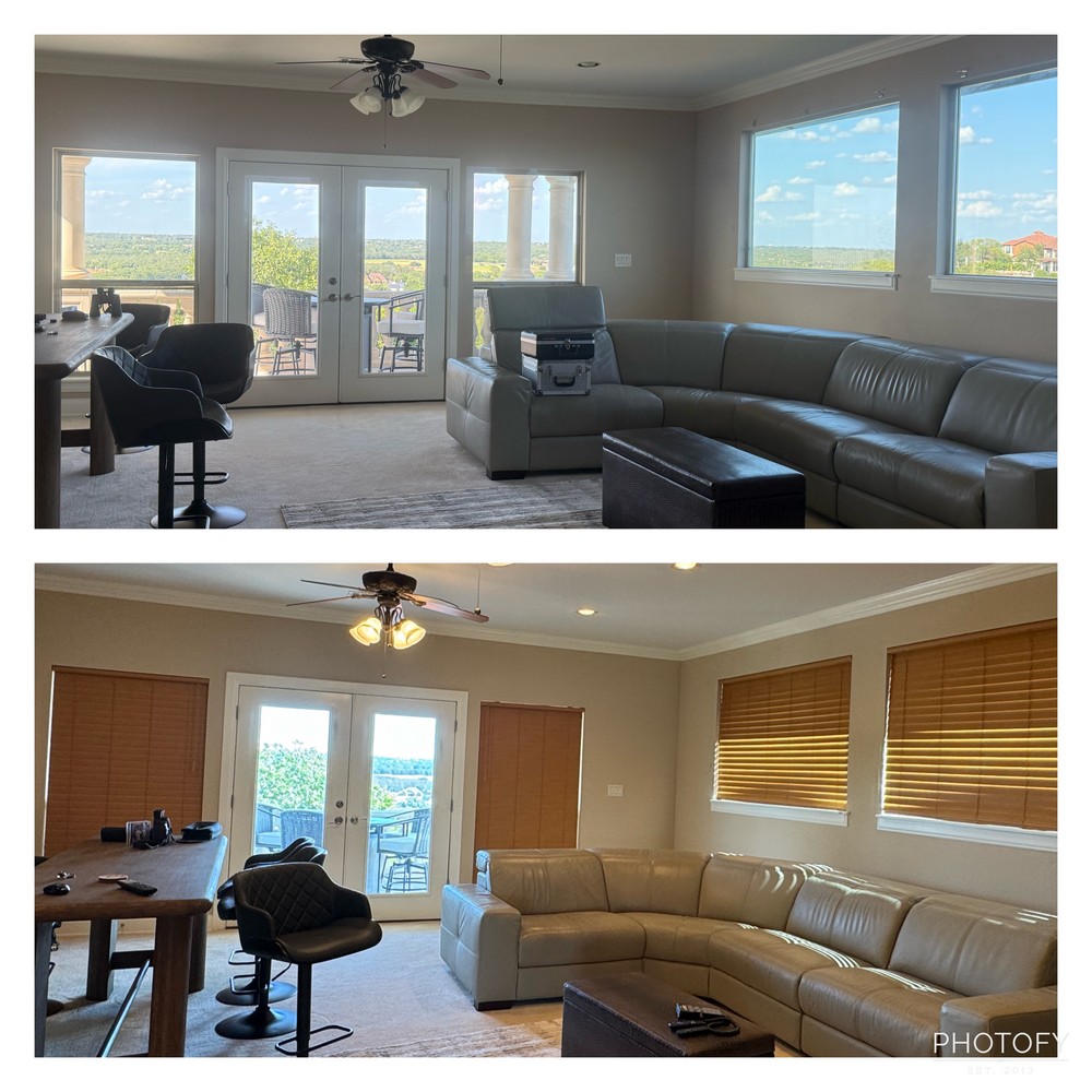 When our customer moved into his new Azle home, it was completely covered with layers of Drapery and Roman Shades. Though this is lovely, it is not the style he was looking for. He preferred clean, straight lines and a pop of color. Instead of the typical white blinds, we chose to move forward with a Chesnut brown colored blind that would complement the home's many chestnut brown accents in the stairwell, fans, rails, bookcases, etc. These colorful blinds brought life to the home! They were such a natural fit that it appears as they are just as much a part of the home's original structure as the other brown wood accents.